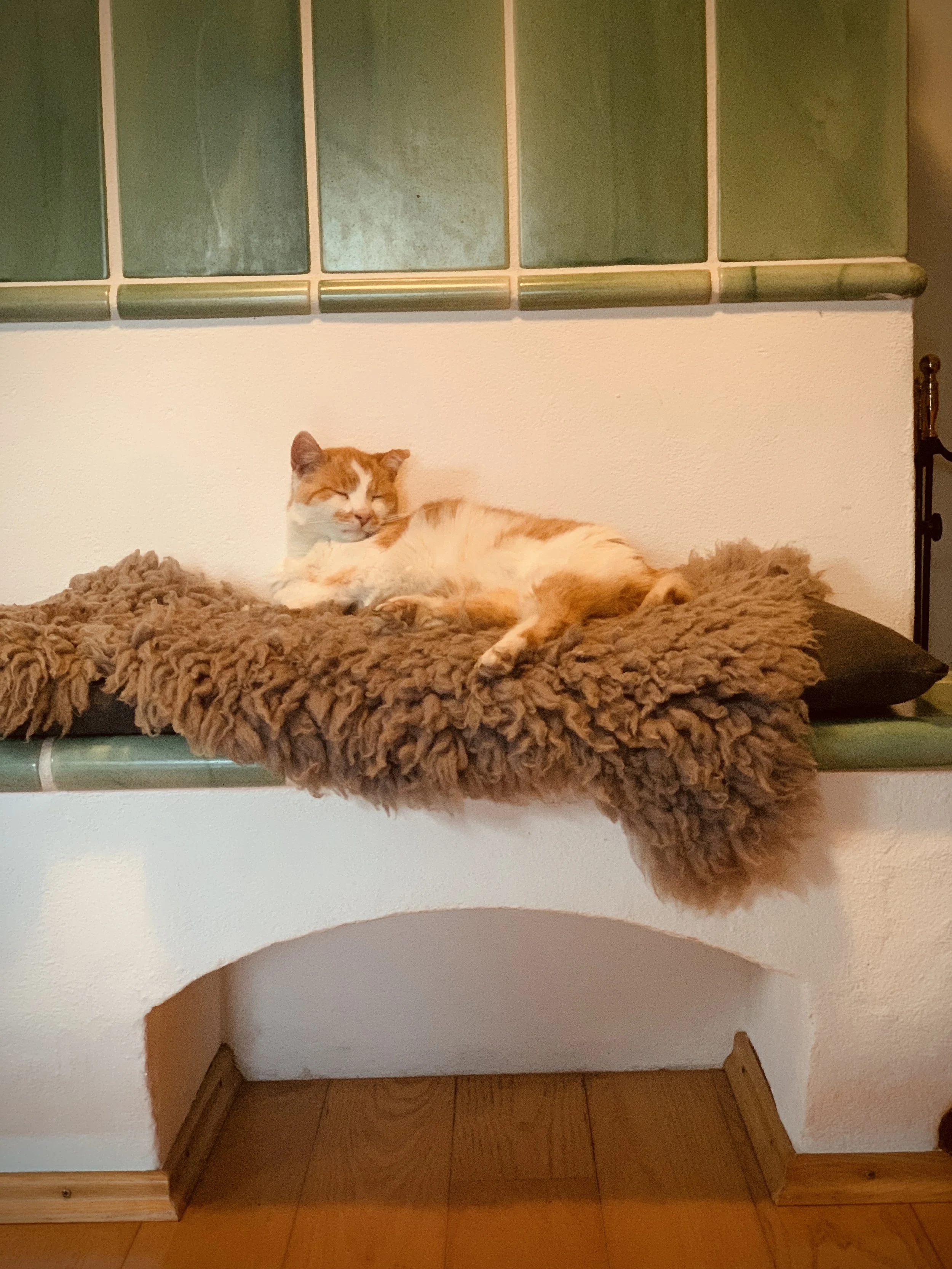 Ich blicke auf Minki, der eingekringelt am Kachelofen liegt.